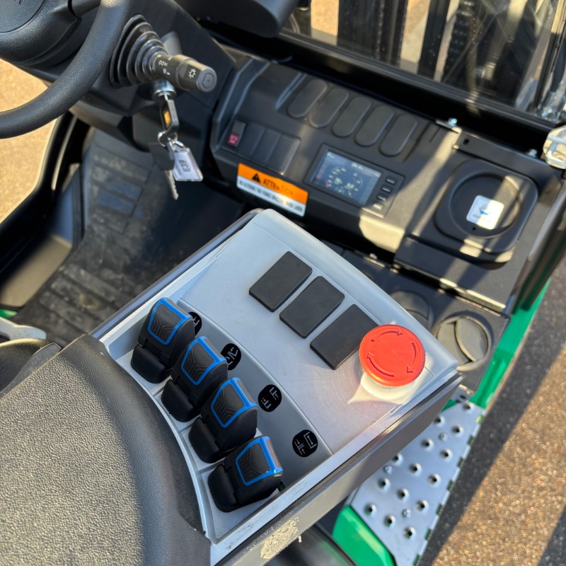 Die verstellbare Armlehne mit Minihebelmodul und integrierten Hydraulikbedienelementen, Fahrtrichtungsschalter, Notausschalter und Hupe sorgt für eine effiziente Bedienung aller Staplerfunktionen.
